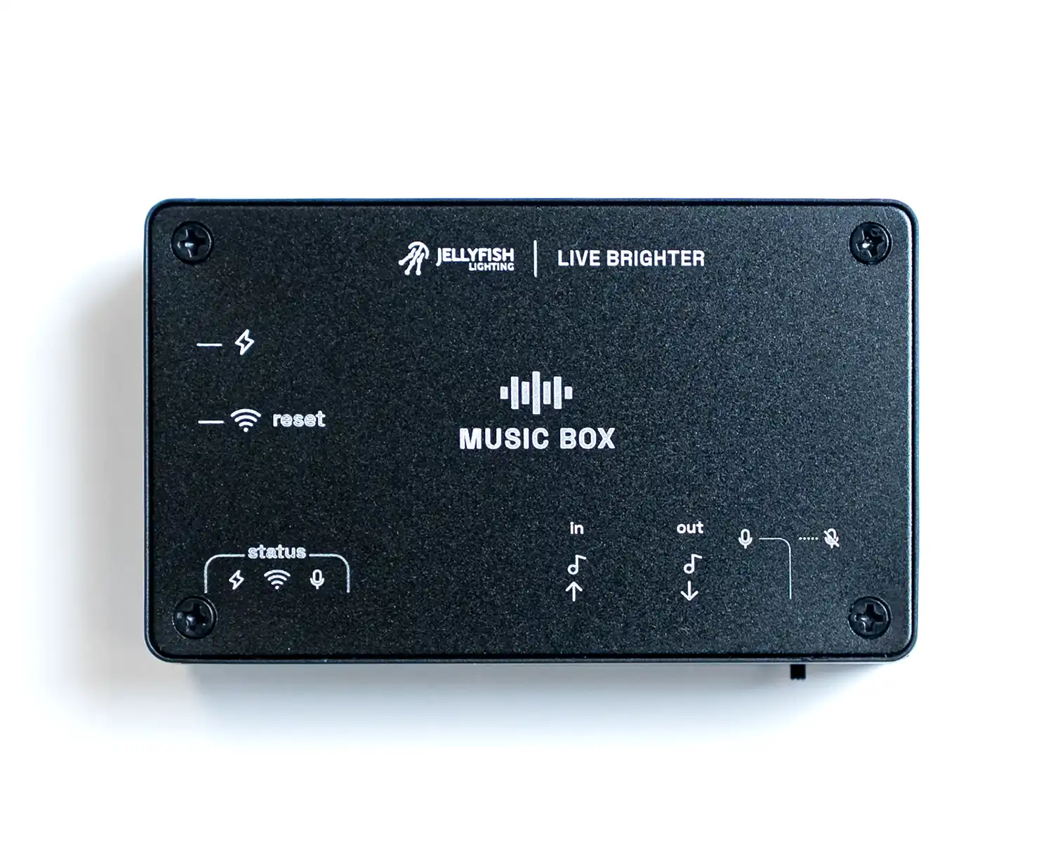 The Music Box adds music-reactive movement to your JellyFish Lighting system — using the built-in microphone or a direct connection to your outdoor audio.