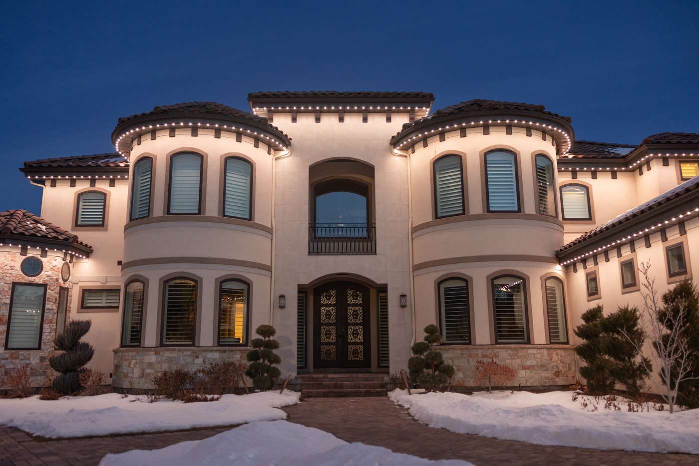 The track color is matched to the color of the home and is installed under the eaves behind the trim with the lights sitting flush. The track encases all wires and jumps are made through attics when possible to prevent visible exterior wires.